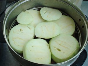 茄子去皮切厚片,蒸熟。如果您用的是长茄子,就不用去皮了。
