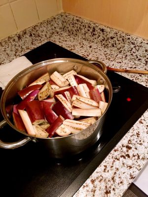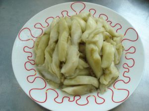 茄子切成条状、在滚水里煮一下、稍微变颜色就好