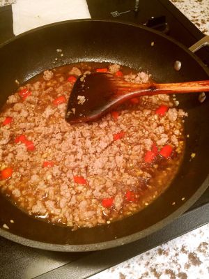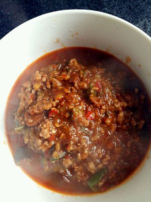 另起一个锅炒香蒜、泡椒、姜、肉末、倒入碗儿汁(酱油、醋、糖、盐、花椒粉、水少量)