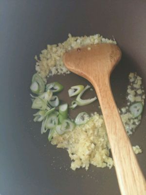 热锅下油,油温升至七十度左右,依次下姜末、蒜末、葱白圈大火快炒。