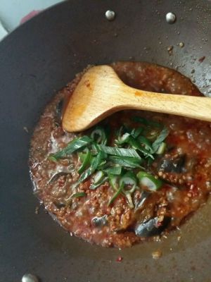 至茄子完全软化后,加入葱青丝,改大火快速翻炒,收汁。