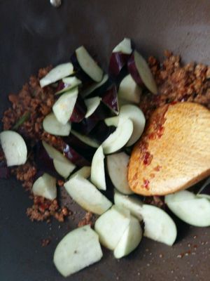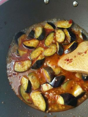 茄子沥干水下锅,翻炒至三面均匀。