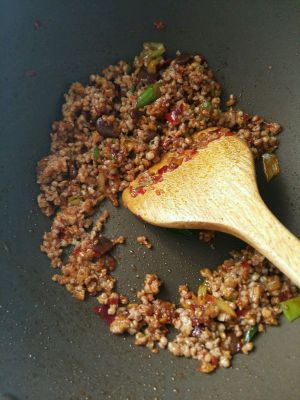 猪肉糜加少许生抽,炒至半熟后分多次少量淋入料酒,继续大火翻炒直到断生。