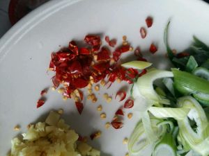 干辣椒剪碎,备用。