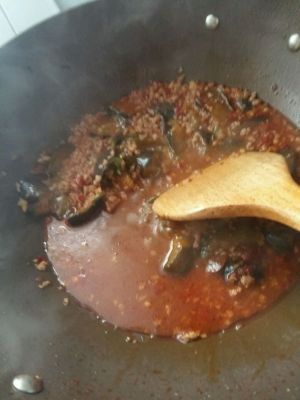 加水或高汤(筒骨汤)没过茄子,再加入辣椒,划匀。