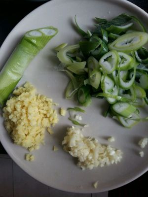 姜、蒜拍碎剁成末;大葱取近葱青部分的少量葱白及葱青,葱白切成宽度半厘米的圈,葱青切成细丝,备用。
