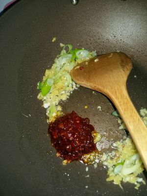 葱姜爆出香味迅速加入豆瓣酱,快速翻炒直至红油冒出。