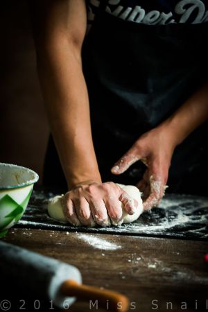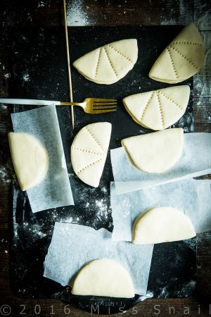 用叉子压出荷叶的纹路,压痕要适当压深一些。避免发酵蒸制完毕之后痕迹看不出来。