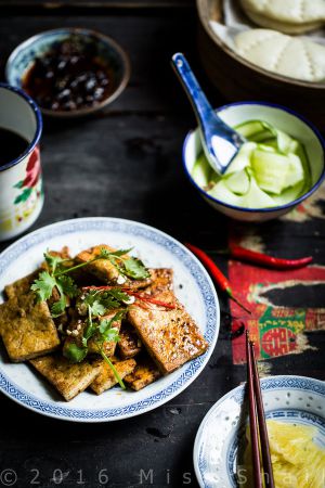 豆腐切成8块,撒五香粉和辣椒粉,煎豆腐,每面煎至金黄。