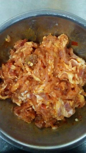 肉丝上薄粉加豆瓣,盐,味精搅拌均匀备用