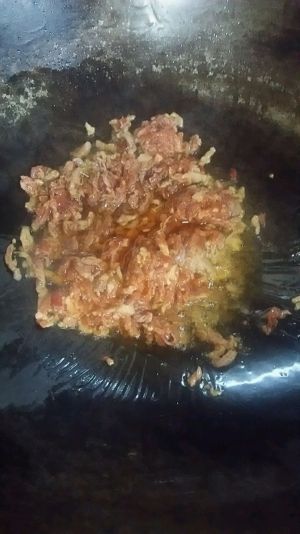 煸炒几分钟把肉推至一边,放入豆瓣酱翻炒,豆瓣酱一定要炒熟