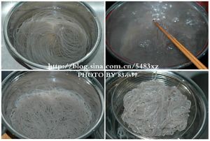 第一步:锅里烧开水,下红薯粉煮软后泡十几分钟即可,这样煮起来方便又快,不然红薯粉硬的时候,煮半天才煮熟还费劲。