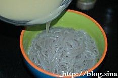 粉丝装碗,淋上高汤后,撒上切成末的榨菜切末,再浇上步骤2里调好的料汁。