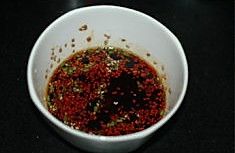大碗里加1大勺辣椒面,倒入热油搅拌均匀后,加2大勺酱油、2大勺米醋,再次搅拌均匀。