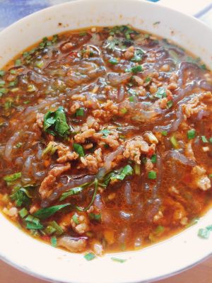 捞出粉,倒入肉末汤,加入花生黄豆,酸豆角和榨菜(买的现成的),撒上香菜