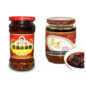 用开水煮土豆粉的同时,把韭菜、香菜切成迷你小段放入碗中,加入一小勺香辣酱和小米辣酱,再倒一点酱油和酸醋.(两种酱如图所示啦)