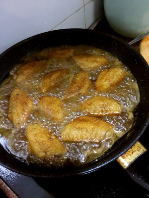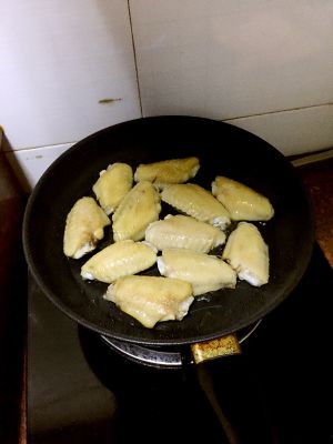 平底锅下油,煎至鸡翅两面金黄色,捞起