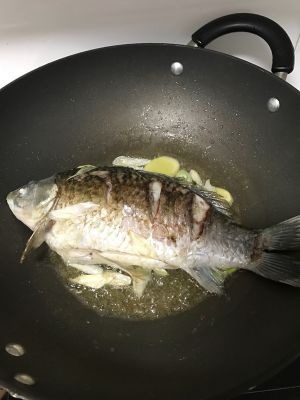 鱼煎至两面微黄,加入葱姜