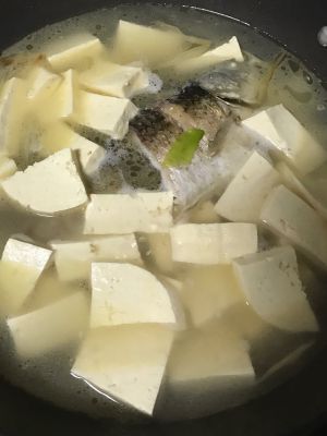 先放一小勺盐 再倒适量陈醋 5秒后倒适量酒。5秒后倒入开水 漫过鱼全身 烧开 倒入豆腐。中火烧15-20分钟。