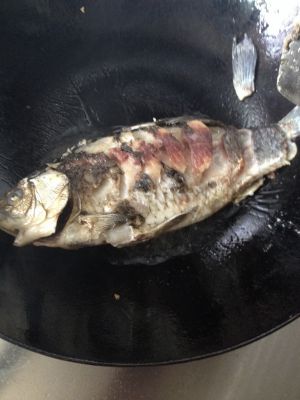 锅烧热,倒入油烧至六七分热,放入鲫鱼煎至两面金黄(我家的锅不好,容易粘锅,见笑了)
