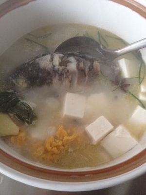 汤熬到奶白色加入豆腐!再小火煲5分钟加入适量盐调味!就可以上桌喽