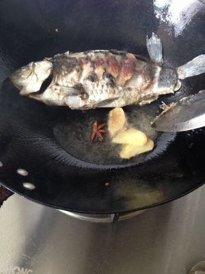 把煎好的鱼推到旁边,放入生姜和八角爆香,