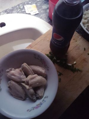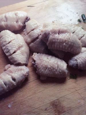 我买的是大鸡翅所以要从中间剁开,好入味。先把鸡翅洗干净焯水。然后在鸡翅上划几道刀口放入料酒里面腌制。