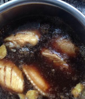 放入食用油少许 加入葱段姜片预热 放入鸡翅炒至两面金黄 记得翻面哟 加入可乐没过鸡翅 一点点酱油 根据口味放 因为后面忙起来来不及拍照了