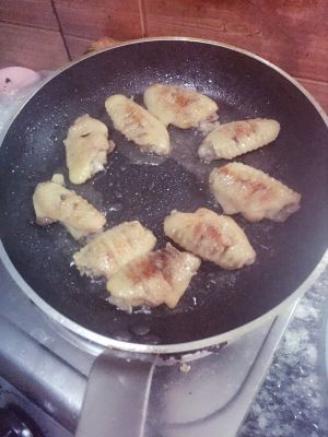 锅中油热后倒入腌制过的鸡翅,翻炒至两面微黄。