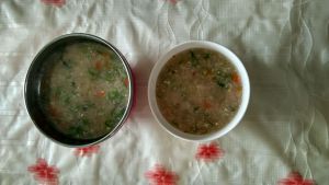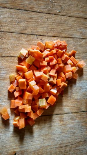 玉米用机子机打成粉状,胡萝卜剁蓉同时保留些许粒状,冬菇泡软切片,干贝洗一遍,然后泡两个小时两个小时!