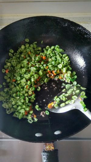 之后就是依次放入葱姜蒜,胡萝卜,豆角开始翻炒,豆角比较耐火,可以多炒一会
