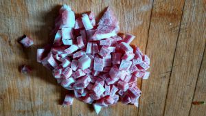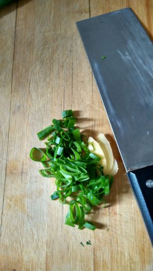 玉米刨成颗粒,蘑菇切片,韭黄切段,肉切片加少许盐和淀粉腌制15分钟。