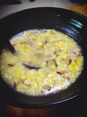 锅里加足够的水,水开后,加入适量油,下玉米粒和冬菇丝,再次滚起后加入瘦肉丝和韭黄粒,滚一会儿加入适量盐,加入打散的鸡蛋(鸡蛋要慢慢走圆形倒,不要一下子全倒进去)