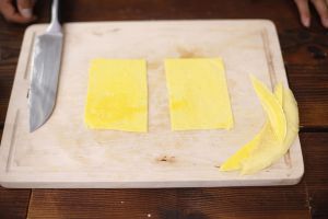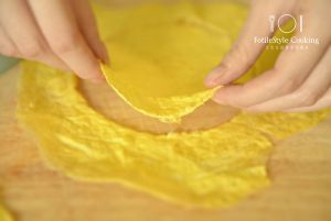将蛋皮切成5平方厘米大小的正方形,放入馅料后包起来,以牙签固定。