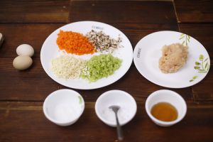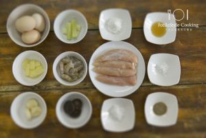准备食材 虾肉80克,鸡肉80克,冬菇2朵,马蹄2个,姜2片,芹菜1棵,鸡蛋4个,粟粉5克,盐3克,糖3克,胡椒粉适量,麻油少许