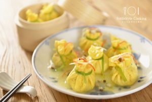 蛋皮逐片包入馅料,用葱叶扎口,排放碟上。