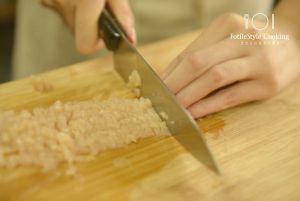 处理食材。将胡萝卜、芹菜、香菇、春笋切成小丁,鸡胸肉剁成泥。