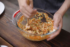 将胡萝卜碎、芹菜碎、香菇碎、笋和鸡肉混合;加入少许黑胡椒粉,再加入适量糖和盐