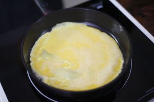 将少许蛋液倒入平底锅,摇匀后小火煎成薄蛋皮;