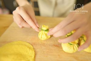 将调好味的鸡丁包入蛋皮中,包成石榴状,用葱扎好口