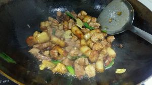 锅里放少许油,放入冰糖。小火慢慢化开后加入肉翻炒均匀。加入料酒,生抽,老抽。
