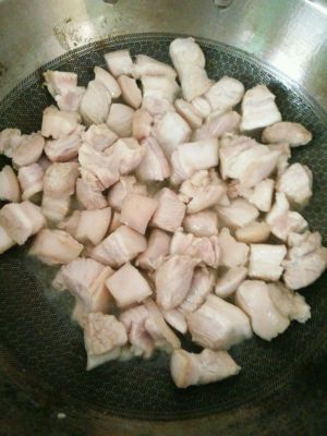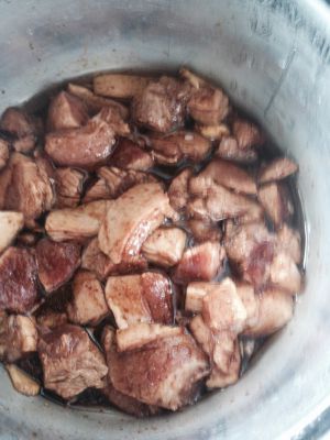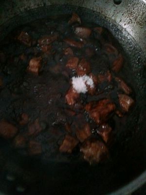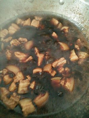把肉放锅里翻炒几下 放入盐 老抽 黄酒水 小火慢炖30分钟 也可以多煮一会儿
