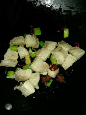 炒锅中加少许油炒香葱段,姜片,八角,我这里还加了两个辣椒,不喜欢可以不加。然后放入五花肉煸炒出油。