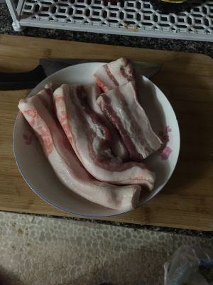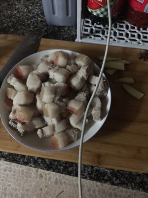 准备好需要做红烧肉的食材,如图所示。肉需要用清水洗净,后设成比大拇指稍大点的块,备用。
