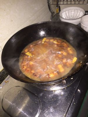 把炒好滴肉放在空滴容器里,后锅放在火上烧热,放点油,再把之前准备好滴白沙糖放到锅里炒。把糖炒到变色后(糖稀),如图所示。放入备好滴清水,再把炒好滴肉块到到锅里,根据自个喜欢的味来调(有滴主喜欢吃甜一点,那就再加点糖;有滴喜欢吃甜咸的就加点盐、味精、生抽……),把姜、草果、八角、葱段也同时放如锅里,先用大火把它烧开,后转小火炖35-40分钟左右。