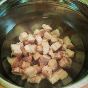 放冷水(冷水一定要淹没肉)煮下 水滚后用冷水冲洗干净待用(因为会有泡沫之类的)