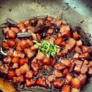 放肉进去翻炒 到肉色有点泛黄就可以倒入之前煮肉留下的汤汁和生抽老抽料酒了 待汤汁煮沸后加糖闷煮 我是用了1个小时左右 期间发现不够甜放了可乐 然后又觉得单调了点 就又放了点玫瑰豆腐乳汁(我觉得做菜随意一点 好吃就行了 哈哈)