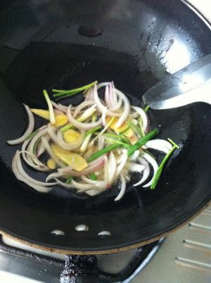 玉米油芝麻油混合加热后倒入小葱、洋葱、姜片爆香