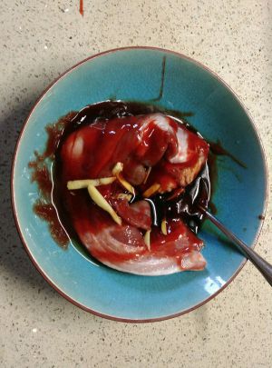 将叉烧酱、生抽、料酒、姜片和适量的盐拌匀涂抹肉上。(料酒和姜片可去除肉腥)