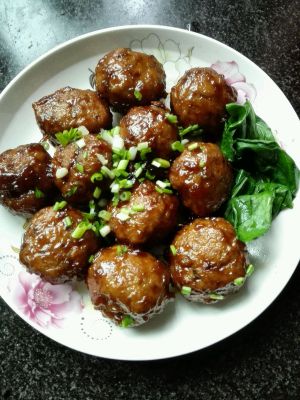 锅中倒入少许油,把炸好的狮子头倒入翻炒几下,再加入料酒,白糖,芡粉,再加入清水,待水分干,糊涂裹上狮子头后,起锅,加入葱花